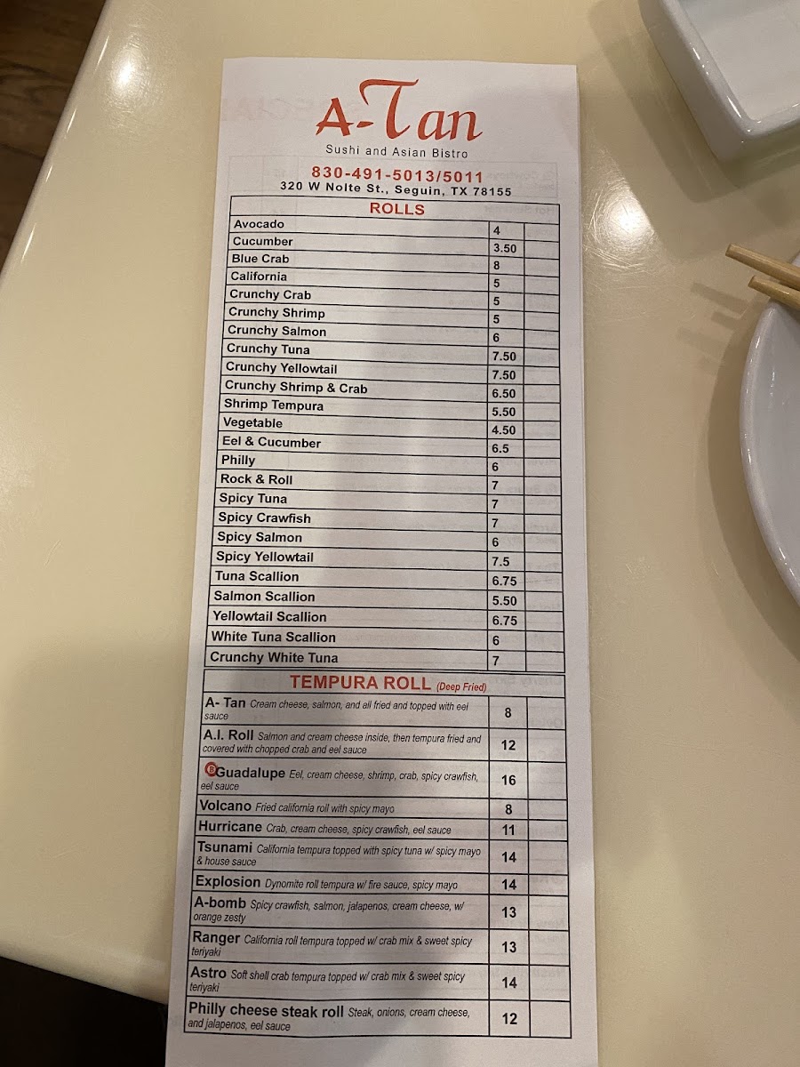 Welcome to A-Tan Asian Bistro & Sushi Bar, a hidden gem nestled in Seguin, TX, where culinary artistry meets Asian comfort. Located at 320 W Nolte St, this vibrant bistro offers a diverse selection of sushi and flavorful Asian dishes that are sure to impress.